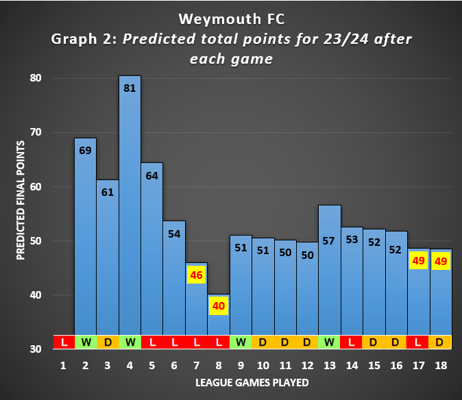 However…if we end up repeating the form we have witnessed over the first 18 games until the end of the season we are expected to hit 48.6pts (let’s call it 48-49 for the sake of argument).