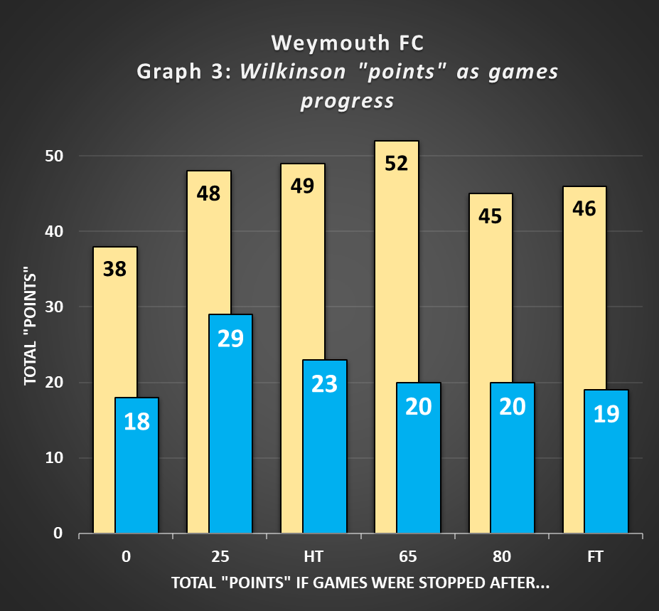 Conversely last season we built on those good starts longer into the game with a high of 52pts for Wilkinson at 65mins before dropping back slightly to 46pts in the final knockings. (Games under Wilkinson gathered 46 of our total 48pts all season)