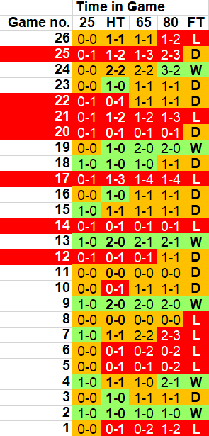Trend 1: Fast start…fast finish…From games 1-11 this campaign we were generally brilliant at starting games, only to fade in the second half. However, from games 12-20 we have completely flipped! In fact we have conceded first in 7 of our last 8. This is a worrying canary in the mineshaft indicator. We cannot continue to give opponents a head start if we want to get enough points to climb the table.