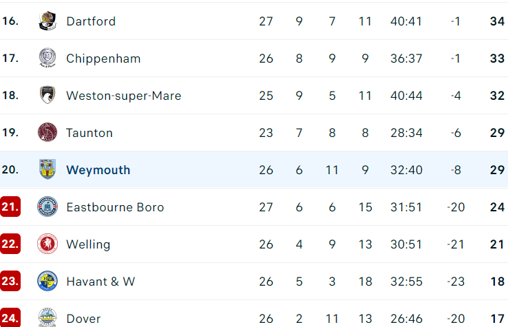 CONCLUSION: If I am right the interest will come from the EASTBOURNE & HAVANT surges – can one or both pull off their own “great escapes”? Will WELLING and/or DOVER surprise everyone? Will TAUNTON pull themselves together with loan signings (two young guns from Bristol City have just arrived for example). Finally…my vested interest…will WEYMOUTH stay steady…if not which way will they go?!…