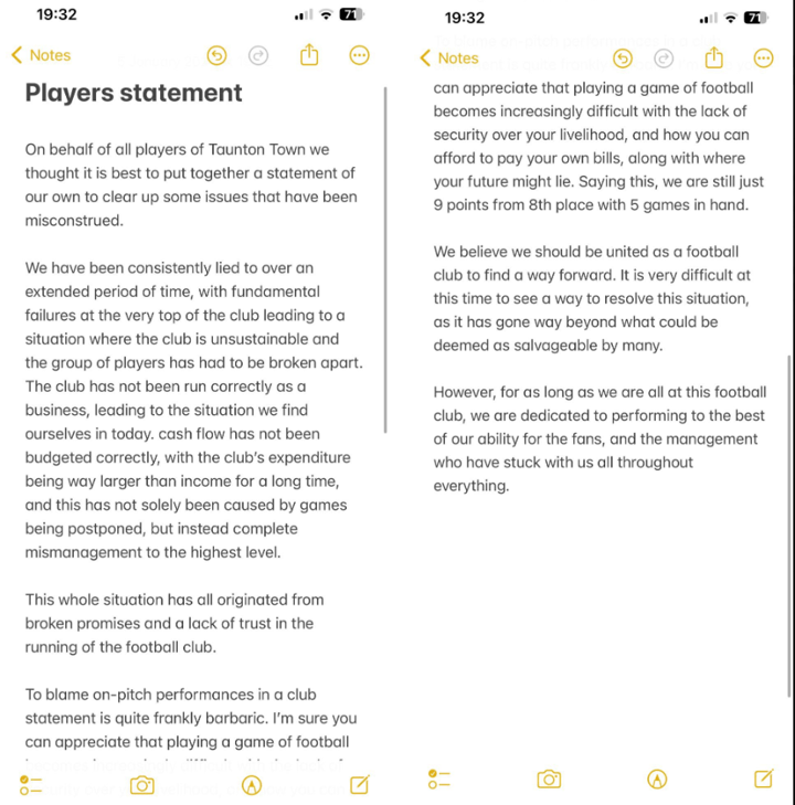 19th TAUNTON – 18pts at 0.80PPG(Finish on 47) “Crisis club”…”Freefall”…Terms often banded about too freely in football but currently those emotive terms are perhaps not far off the mark. They have worked wonders as a club to reach this level and stay there into this season but it appears the money is running out at Wadsworth Road and the “we are in this together” spirit that probably helped them stay up last season has come crashing down spectacularly in recent weeks. Rumours abounded in December that all was not well and then, following more poorly explained player departures, the chairman released a statement hoping to steady the ship. In the face of costly festive home postponements (in part due to their infamous poor-draining pitch) it clearly didn’t wash with the players. Loyal Lloyd Irish (goalkeeper and coach for 15 years at the club on and off) released his own statement on behalf of the playing squad, in the “classic style”…cut and paste from “Notes” on his phone without cropping the time or battery level…