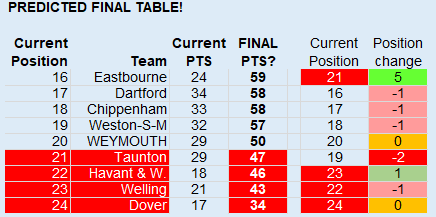 DARTFORD in 16th are on paper most at risk of being drawn in but even if they have a very poor last 20 games, just a 1 point average would see them go from 34-54 points and surely safe. Their current form suggests they might not do much better than than so I going to say they will average 1.25PPG from here on in to finish on 58. Relief but massively underachieving for a club used to battling in the playoffs each year and last season they were runners-up! Clearly the Dartford board have had enough and on January 11th relieved manager Alan Dowson of his duties.