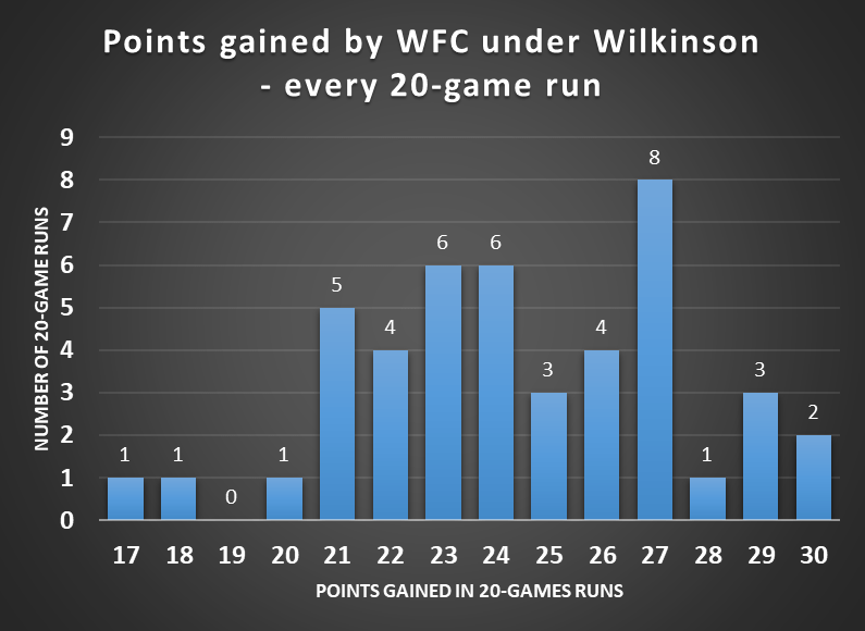 4. Wilkinson’s 20-game record…Looking at every 20 game league run under Wilkinson since last season (1-20, 2-21etc) the average churns out at 24 points for a slightly more optimistic final tally of 53.