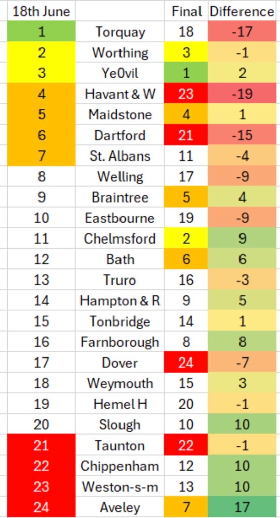 I’m gonna give myself a small pat on the back here as I was “pretty close” with 42% of the league. I correctly guessed Worthing, Maidstone and Braintree would all make the playoffs and that Taunton would go down. And sorry Louie but Hemel finished one worse than 19th in 20th and I was delighted as being only one out it was my joint closest guess!