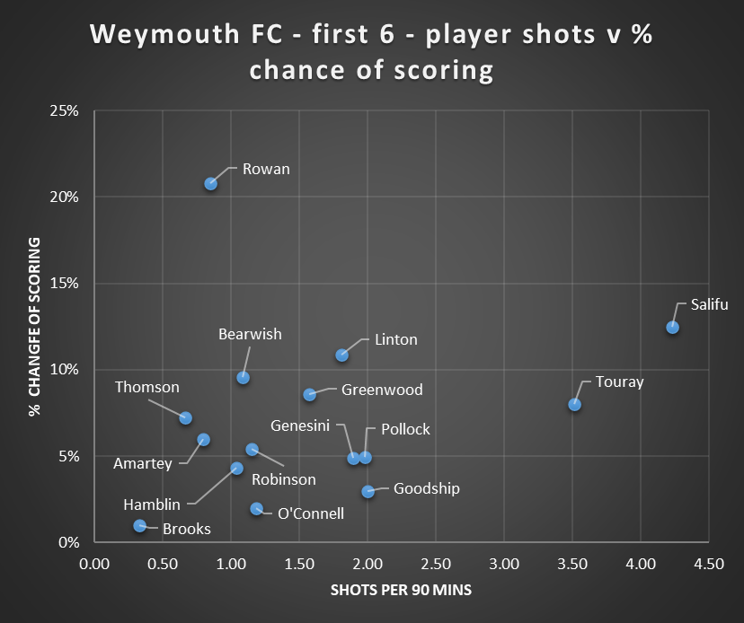 For example, it suggests currently that Rowan is our best marksman as, on average, each of his shots had a 21% chance of going in. However, he only averages 0.85 shots over 90 mins so does not shoot regularly. Conversely it shows that Salifu shoots most often with 4.24 in 90 mins (although this was 4 shots in 85 minutes overall and from just one game, a small sample).