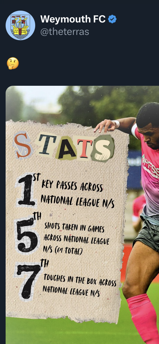 “5th – shots taken across national league N/S” – We are ranked 5th across the 48 clubs at our level in terms of shots taken. Chances taken! Even better then!